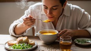 Questo passaggio è fondamentale per preparare il palato e per attivare i sensi prima di assaporare il cibo. Un altro esercizio efficace è quello di praticare la “meditazione del tè”.